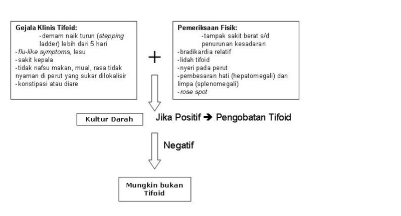 Untuk membantu penegakkan diagnosis, yang dijadikan standar baku adalah ditemukannya kuman S typhi pada biakan darah, biakan sumsum tulang, biakan getah empedu, biakan feses (yang paling lazim dikerjakan adalah kultur darah). Sementara itu pemeriksaan Widal tidak dianjurkan pada daerah-daerah endemis, seperti di Indonesia ini.