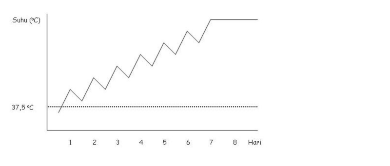 Setelah kuman masuk ke dalam saluran cerna, akan ada masa tanpa gejala (masa inkubasi) sekitar 7-14 hari. Pada saat bakteriemia, akan timbul demam. Suhu tubuh awalnya akan naik perlahan dan lebih tinggi setiap malamnya dari malam sebelumnya, dikenal dengan istilah Stepping ladder (lihat gambar). Oleh karena itu, suhu tubuh harus diukur menggunakan termometer dan bukan hanya dengan perabaan. Hal ini berlangsung selama 7 hari, lalu setelah itu, suhu tubuh akan menetap tinggi sekitar 39-40 oC.