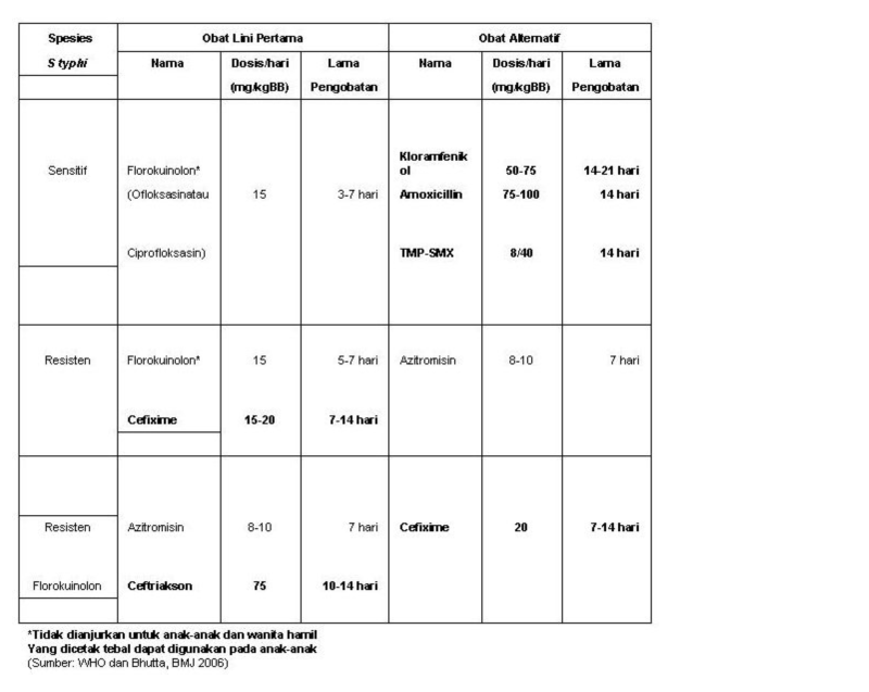 Jika kuman S typhi sudah resisten dengan florokuinolon, maka azitromisin dan golongan sefalosporin generasi terbaru (misalnya cefixime atau ceftriakson) dapat digunakan. Ceftriakson cukup aman untuk anak-anak dan wanita hamil.