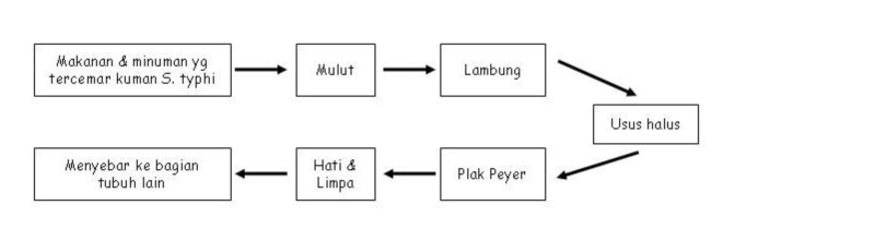 Setelah sampai di usus halus, kuman ini akan menempel di kelenjar getah bening di dinding usus bagian dalam (plak Peyer). Lalu kuman menembus dinding usus bagian dalam dan menyebar ke kelenjar getah bening usus lainnya sampai ke hati dan limpa.